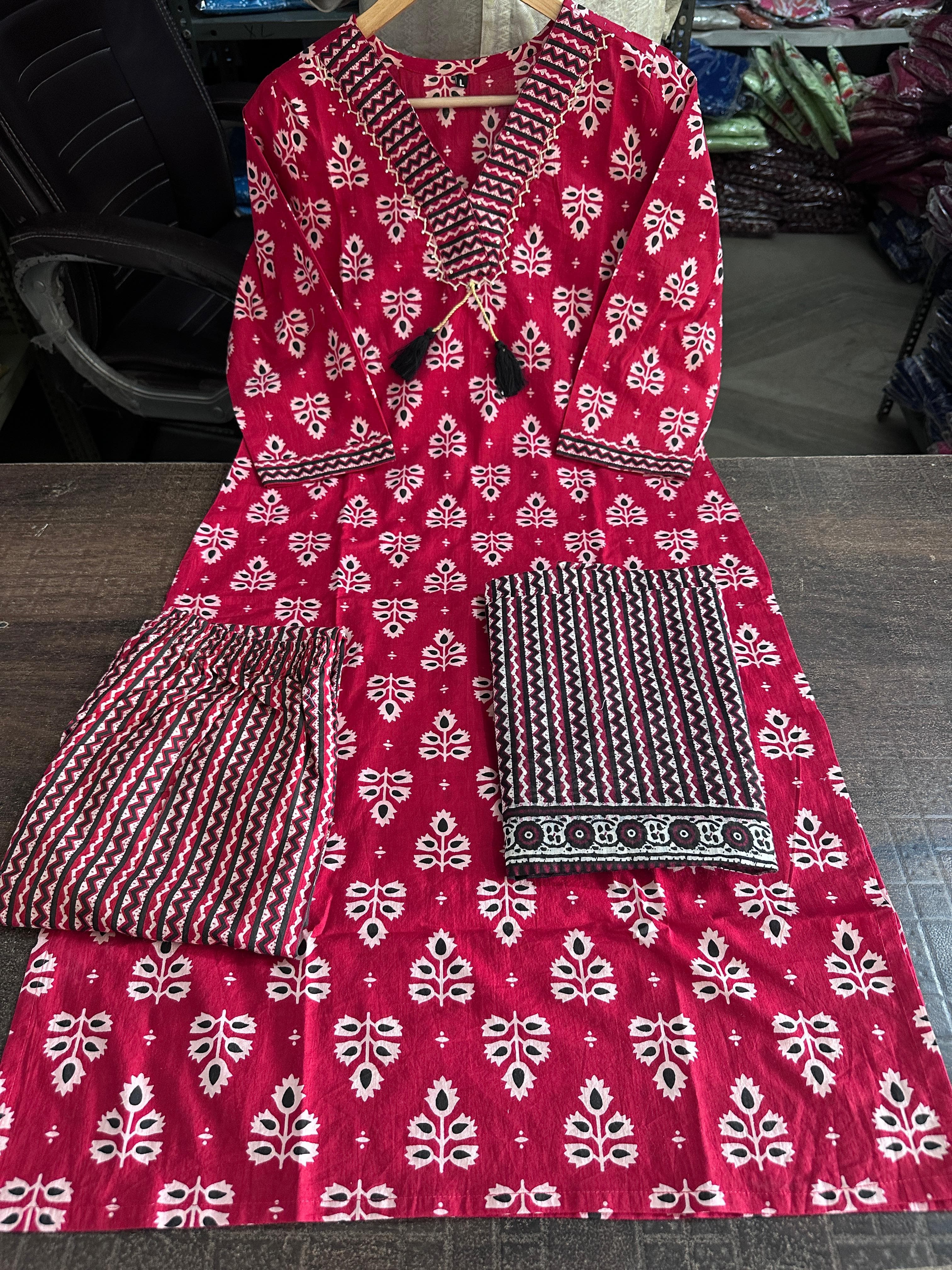 *🌹🌹Pure fine Cotton fabric Embroidery Work Kurti with Pant with cotton 100-100 Dupatta*🌹🌹