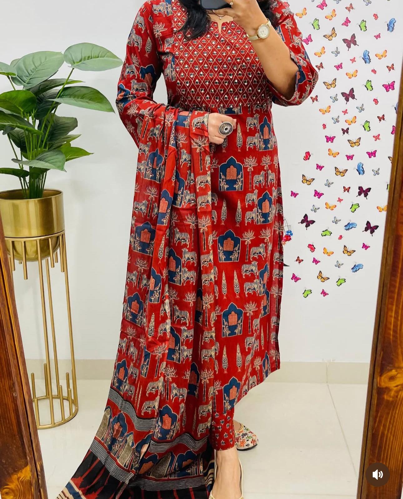 *Traditional Print Rayon kurti with pant and malmal dupatta*