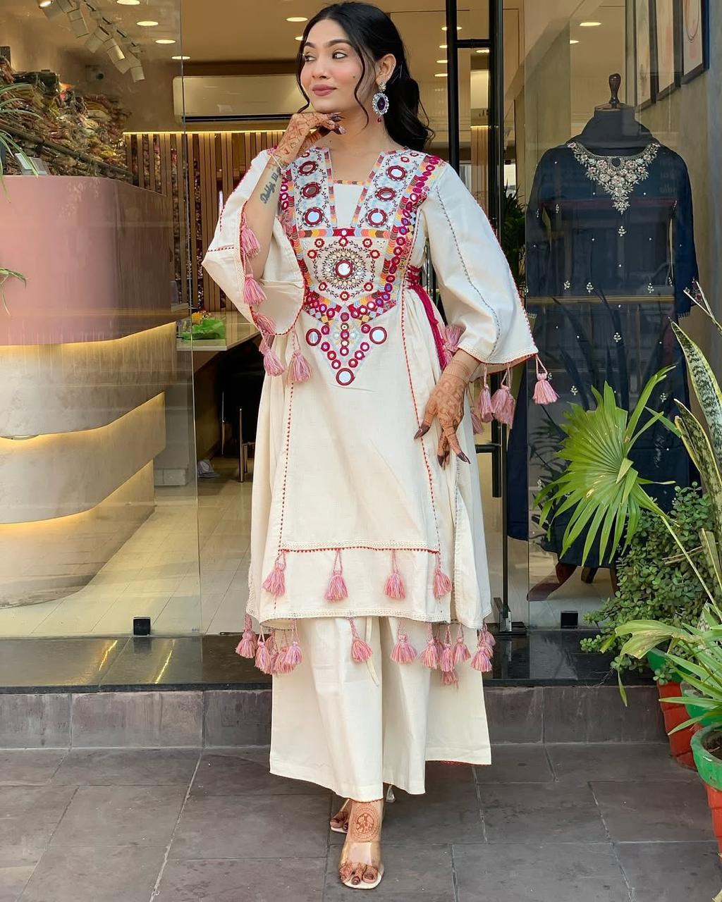 _*new Launching Beautiful Designer Peplum & Bell Bottom Set On cotton Fabric With foil 🪞 mirror work , Tassels & Laces*_