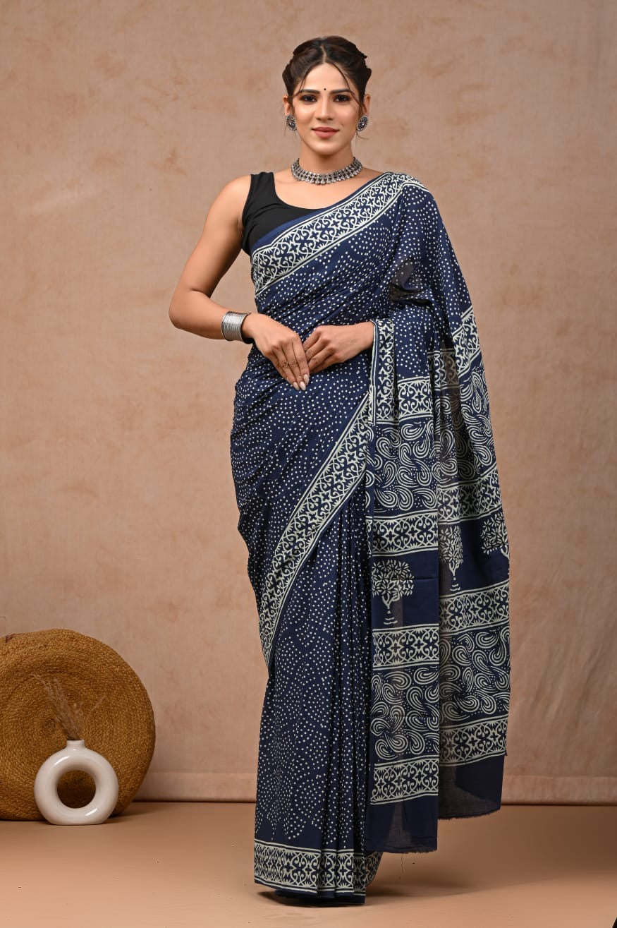 Traditional Authentic Hand Block Printed Pure Organic Cotton Sarees With matching Blouse.